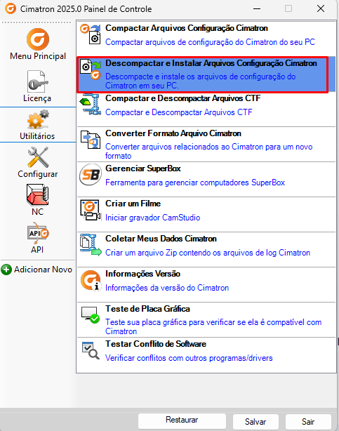 Para carregar as configurações no outro computador abra o Painel de Controle do Cimatron 2025 e vá no campo de "Utilitários".