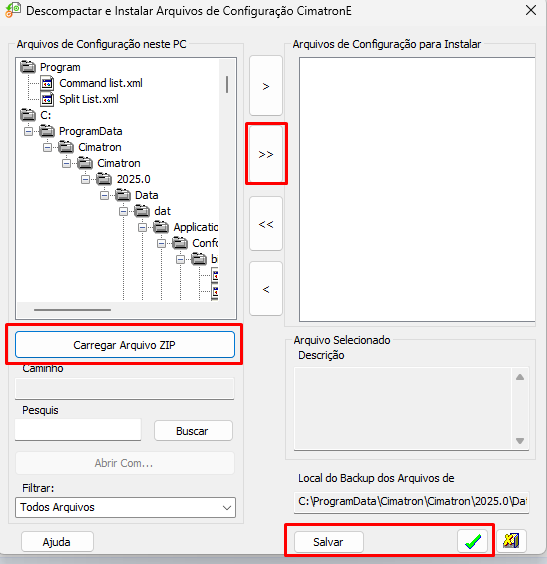 Carregue o arquivo ZIP, clique nas setas destacadas como na imagem, depois salve e confirme.