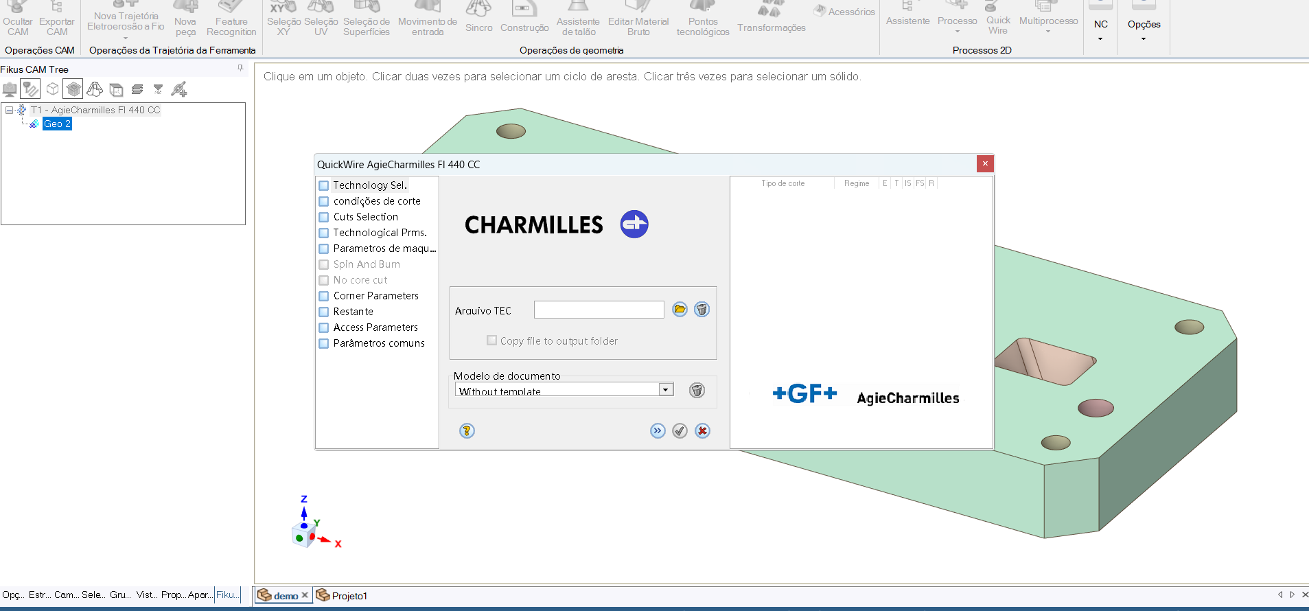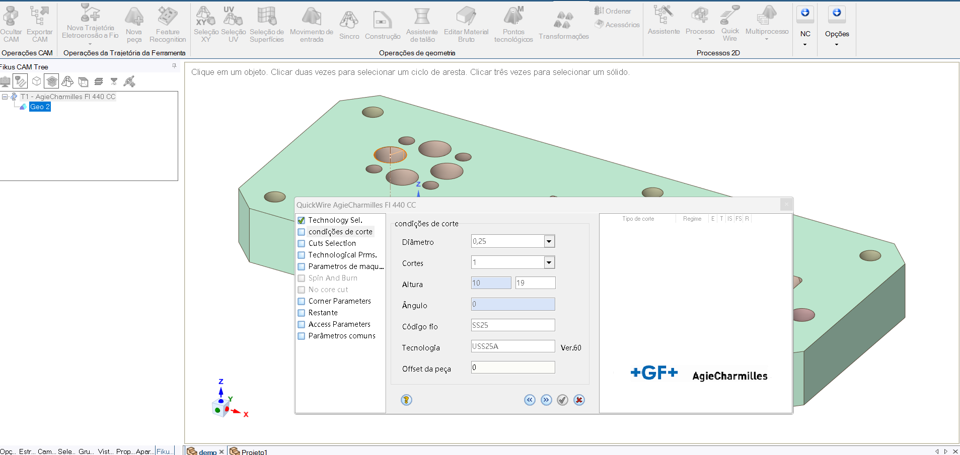 O Fikus Visualcam para eletroerosão a fio é um software CAD/CAM altamente automatizado que utiliza Assistentes de Tecnologia para definir as condições de corte: