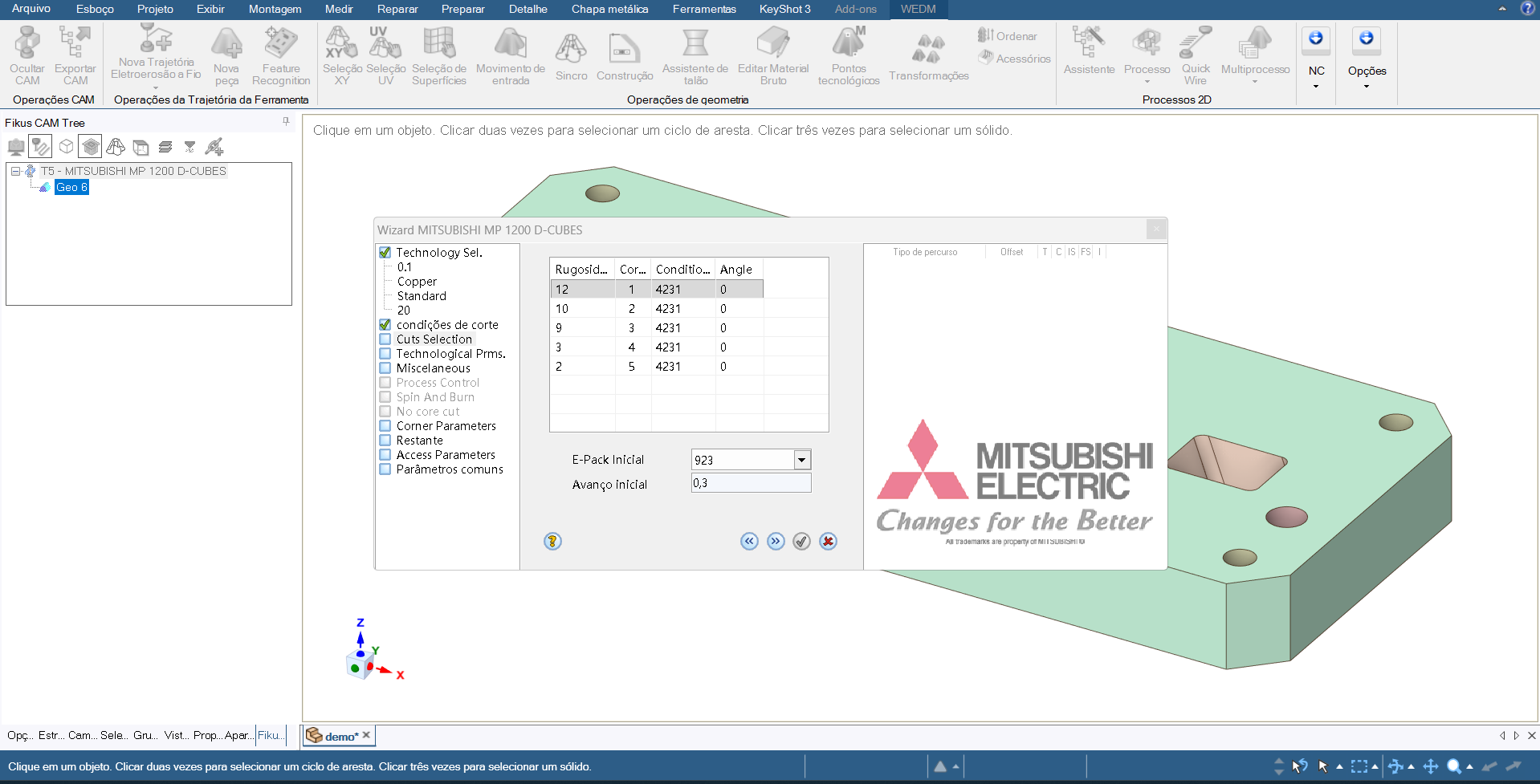 Mitsubishi Especialization : Para máquinas de eletroerosão a fio Mitsubishi, o Fikus integra especificamente os números E-PACK para determinar as condições de usinagem.